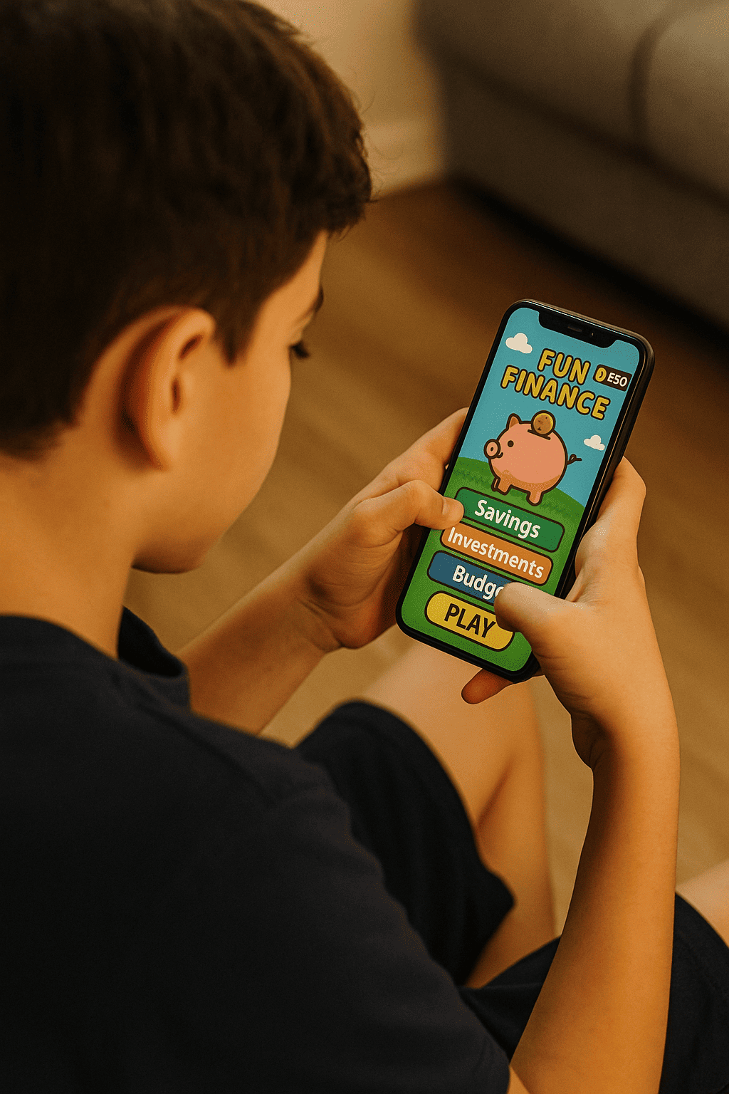 Jogo interativo que ensina crianças sobre poupança, investimento e consumo consciente por meio de desafios e recompensas.