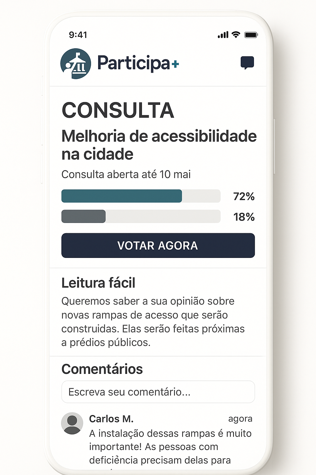 Plataforma digital que aproxima cidadãos e governos, permitindo votação, debate e acompanhamento de políticas públicas.